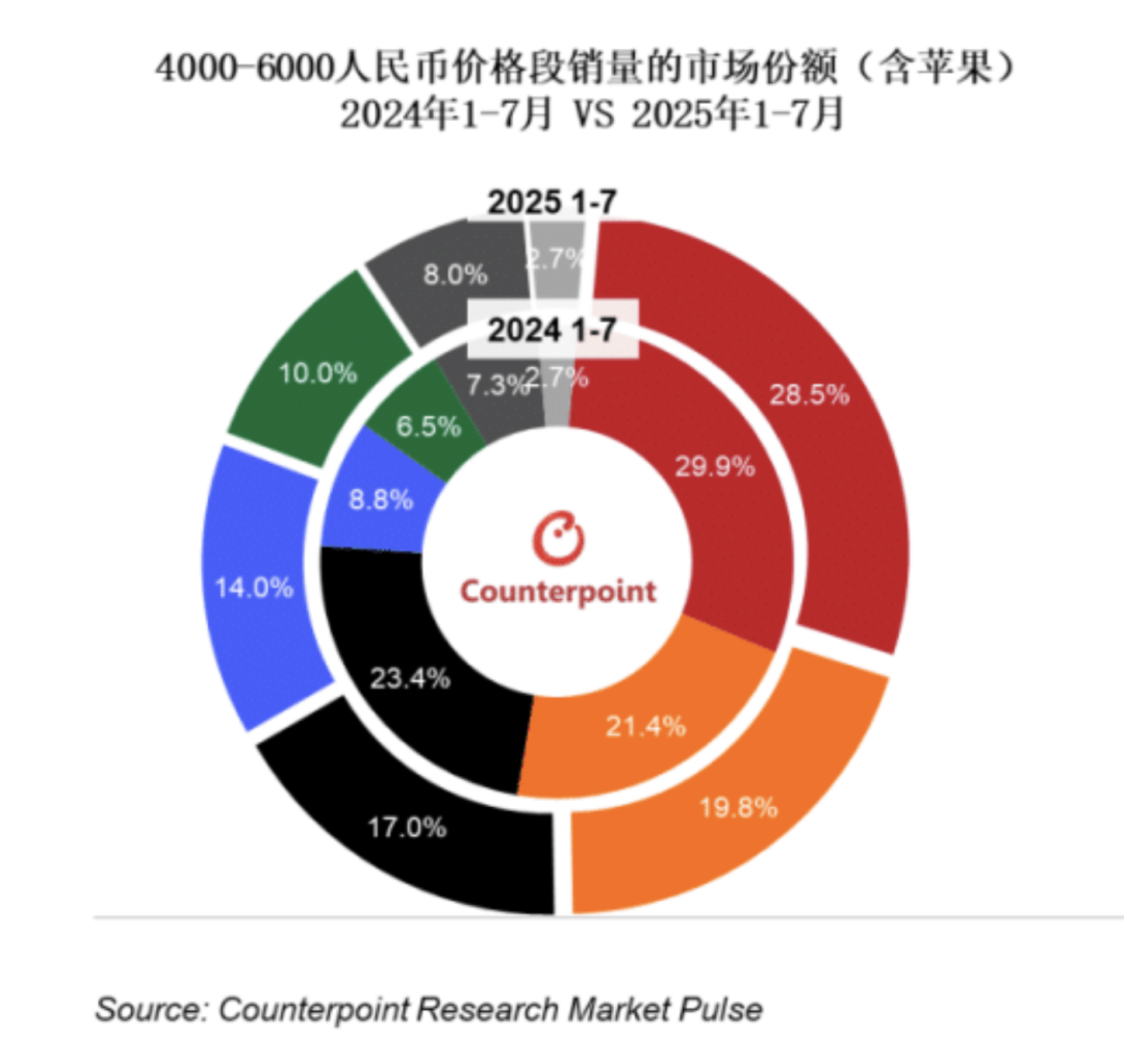 此外,在4000-6000元价格段的高端手机市场,vivo在2025年1月至7月实现了显著的份额放量增长,其市场份额从8.8%提升至14%。与此同时,苹果在该价格段的份额受到国产品牌挤压,从23.4%降至17%。vivo也成为前三品牌中唯一实现在该价格段份额提升的厂商,呈现放量增长态势。