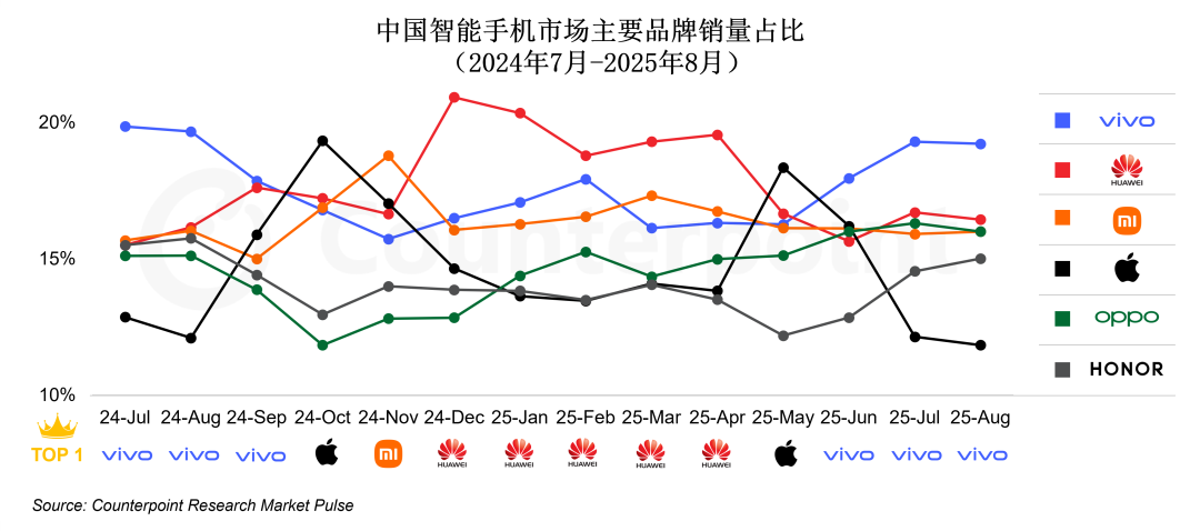 更令人震撼的是市场格局的剧变。储殷坦言:"我知道华、小、v三家做的比较大,但没有想到做得这么好。"根据Counterpoint Research发布的2025年第三季度中国市场智能手机销量数据显示,华为、vivo和小米已稳居市场前三,份额合计超过50%。具体来看,华为与vivo均占据17.6%的市场份额,小米也达到16.4%。这意味着,中国每卖出两部手机,就有一部出自“华小v”之手。